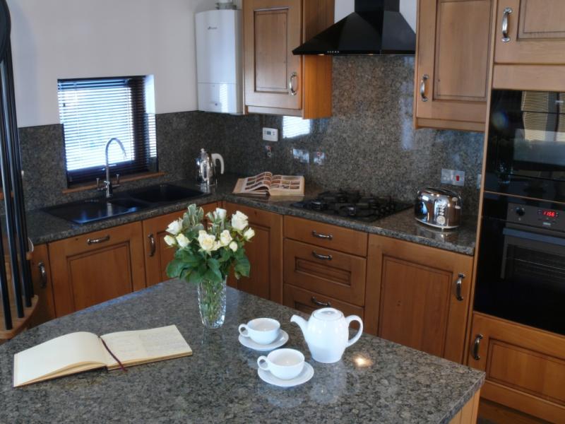 Lounge here enjoying the views, or snuggle to watch widescreen satellite tv, warmed by a contemporary wood-burning stove. A cosy dining area next to the west window is perfect for romantic dinners from a fully-equipped kitchen.